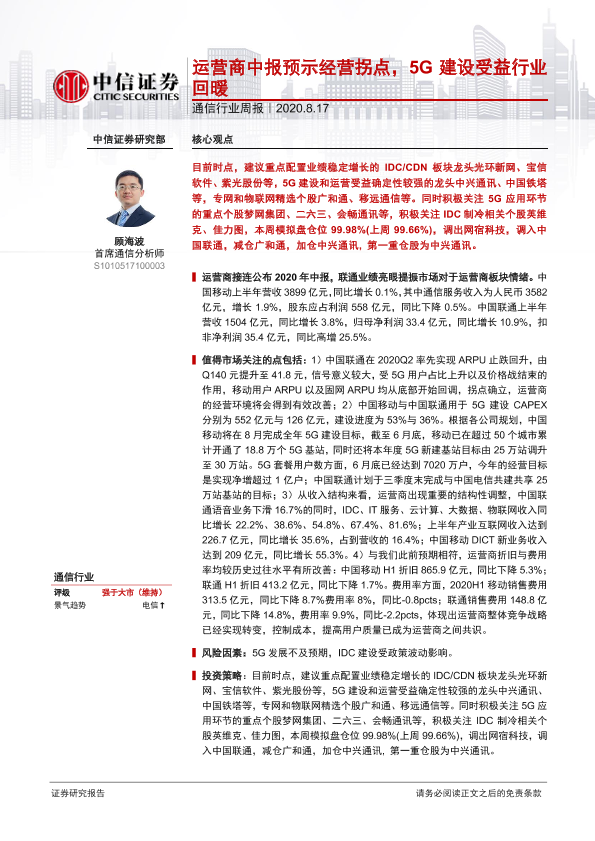 【中信证券】【20200817】通信行业周报:运营商中报预示经营拐点,5G建设受益行业回暖-10页