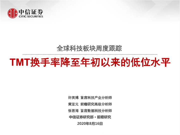 【中信证券】【20200816】全球科技板块周度跟踪:TMT换手率降至年初以来的低位水平-40页