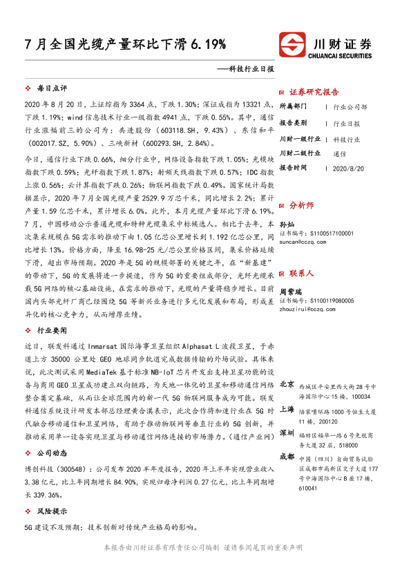 【川财证券】【20200820】7月全国光缆产量环比下滑6.19%-4页
