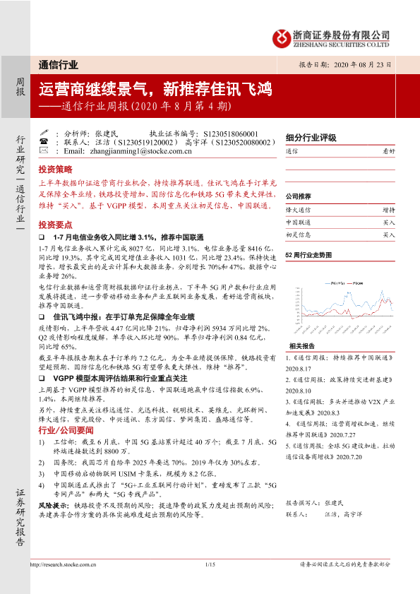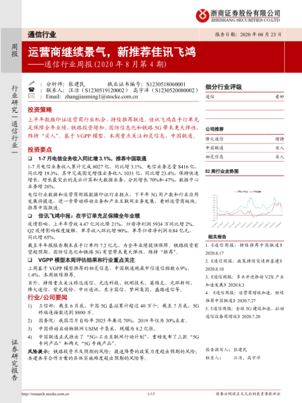 【浙商证券】【20200823】20200823-浙商证券-通信行业周报(2020 年8月第4期):运营商继续景气,新推荐佳讯飞鸿-15页