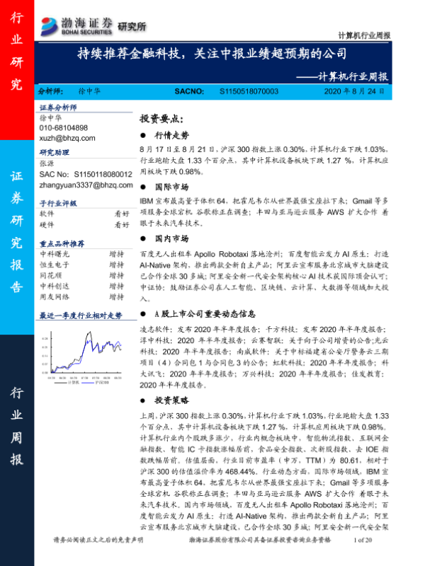 【渤海证券】【20200824】计算机行业周报:持续推荐金融科技,关注中报业绩超预期的公司-20页