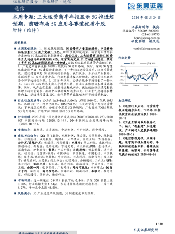 【东吴证券】【20200824】本周专题:三大运营商半年报显示5G推进超预期,前瞻布局5G应用各赛道优质个股-20页