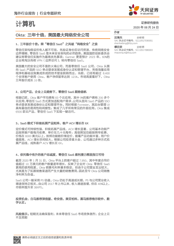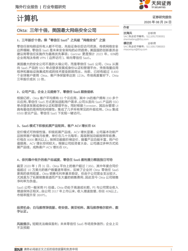 【天风证券】【20200824】Okta:三年十倍,美国最大网络安全公司-16页