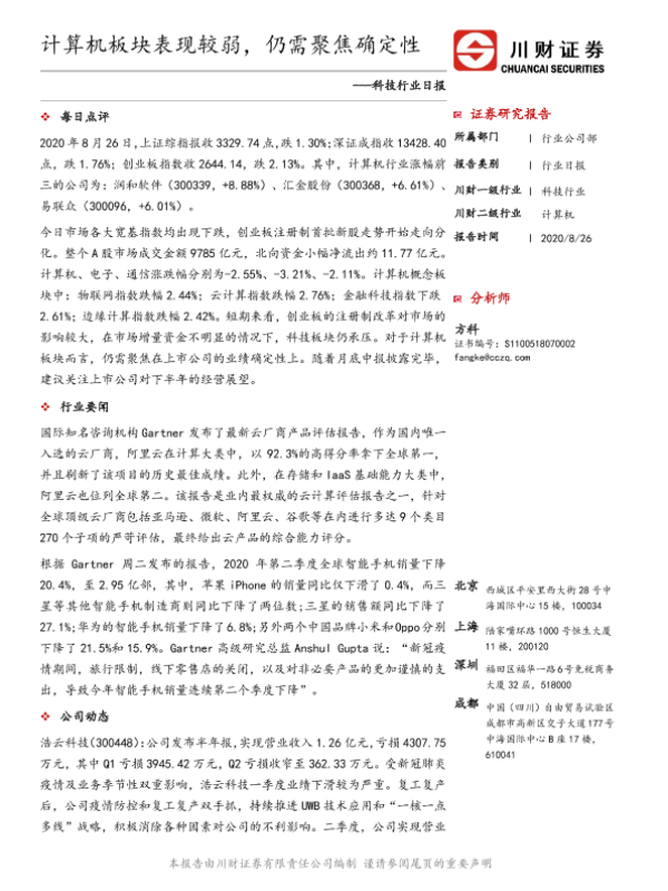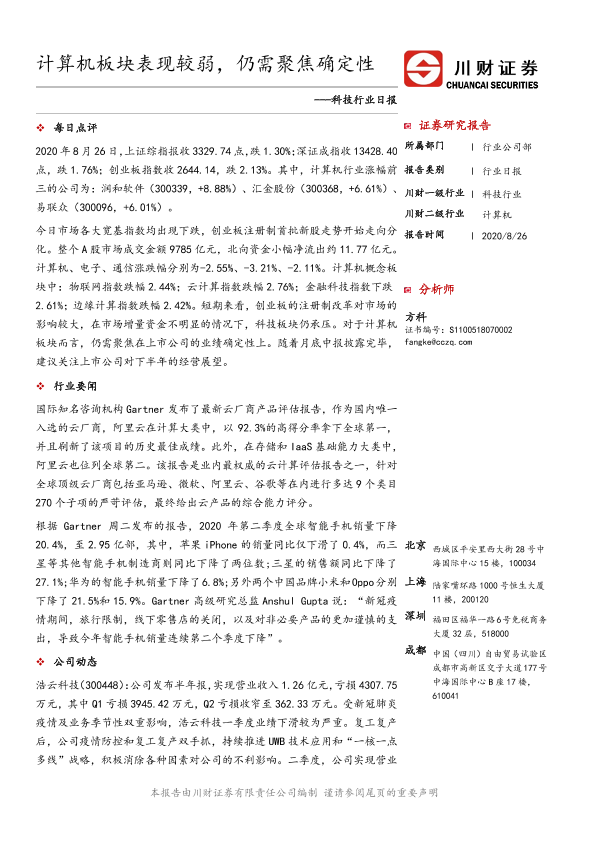 【川财证券】【20200826】科技行业日报:计算机板块表现较弱,仍需聚焦确定性-3页