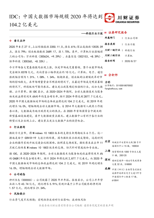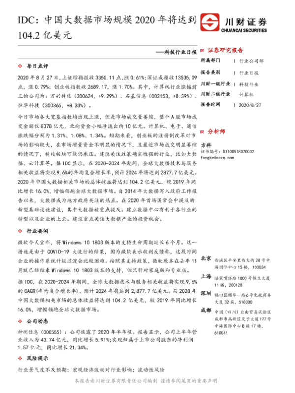 【川财证券】【20200827】科技行业日报:IDC:中国大数据市场规模2020年将达到104.2亿美元-3页