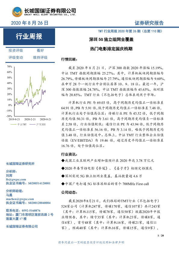 【长城国瑞证券】【20200826】TMT行业周报2020年第26期(总第110期):深圳5G独立组网全覆盖 热门电影排定国庆档期-20页