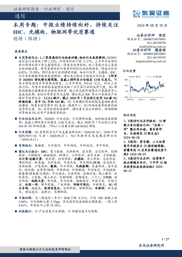 【东吴证券】【20200830】通信本周专题:中报业绩持续向好,持续关注IDC、光模块、物联网等优质赛道-27页