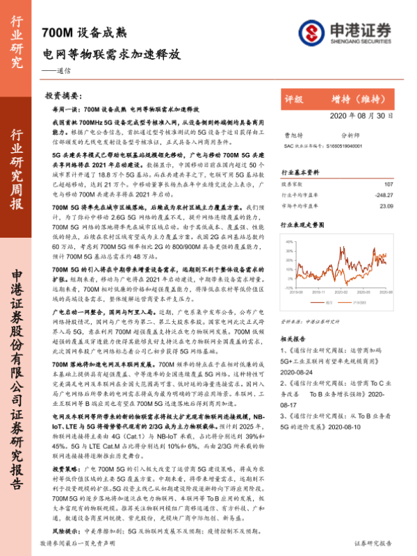 【申港证券】【20200830】通信行业研究周报:700M设备成熟 电网等物联需求加速释放-19页