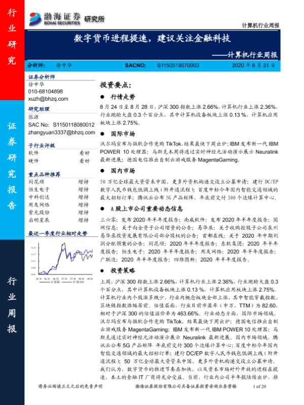 【渤海证券】【20200831】计算机行业周报:数字货币进程提速,建议关注金融科技-20页