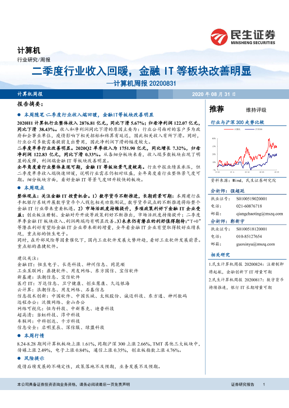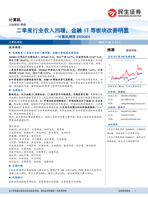 【民生证券】【20200831】20200831-民生证券-计算机周报:二季度行业收入回暖,金融IT等板块改善明显-18页