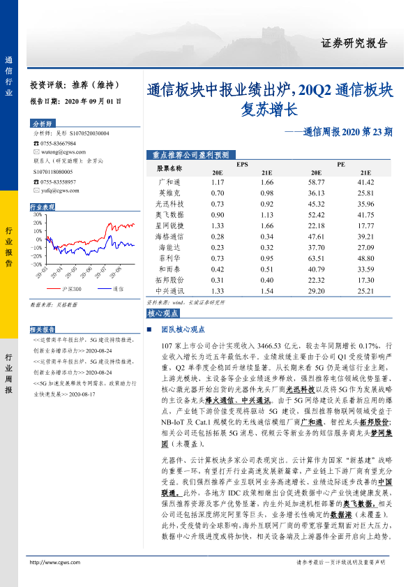 【长城证券】【20200901】通信周报2020第23期:通信板块中报业绩出炉,20Q2通信板块复苏增长-29页