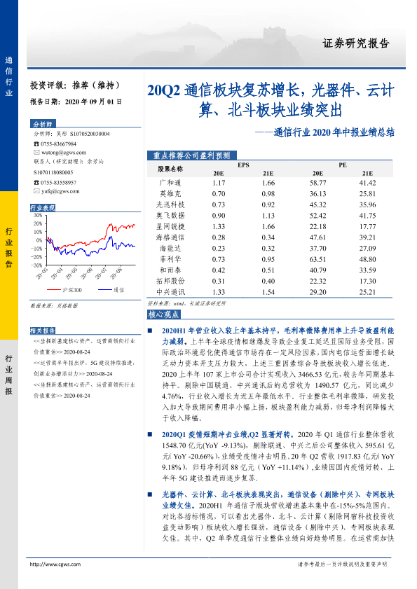 【长城证券】【20200901】通信行业2020年中报业绩总结:20Q2通信板块复苏增长,光器件、云计算、北斗板块业绩突出-27页