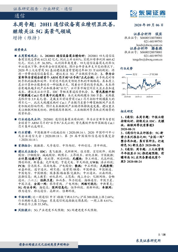 【东吴证券】【20200906】本周专题:20H1通信设备商业绩明显改善,继续关注5G高景气领域-18页