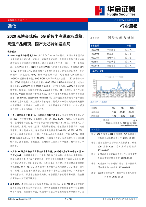 【华金证券】【20200906】2020光博会观感:5G前传半有源逐渐成熟,高速产品频现,国产光芯片加速布局-18页