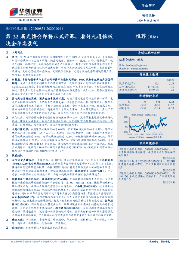 【华创证券】【20200906】20200906-华创证券-通信行业周报:第22届光博会即将正式开幕,看好光通信板块全年高景气-20页