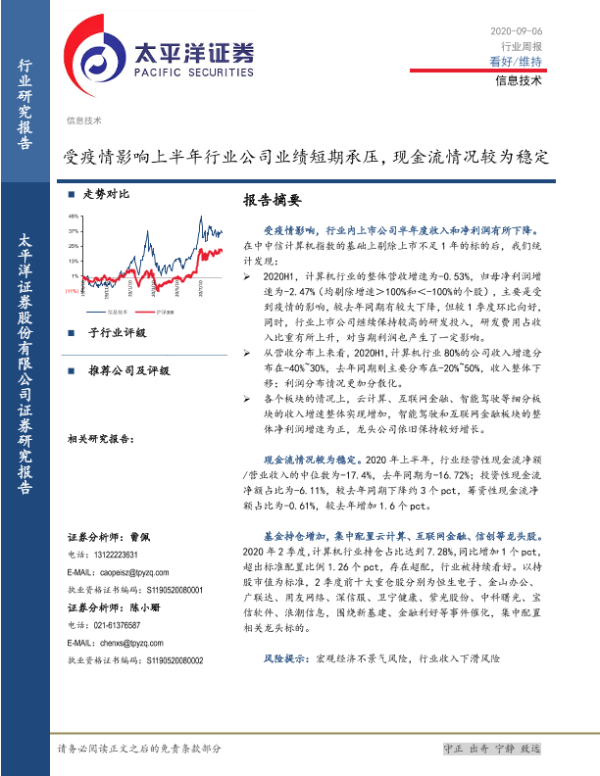 【太平洋证券】【20200906】20200906-太平洋-信息技术行业周报:受疫情影响上半年行业公司业绩短期承压,现金流情况较为稳定-10页