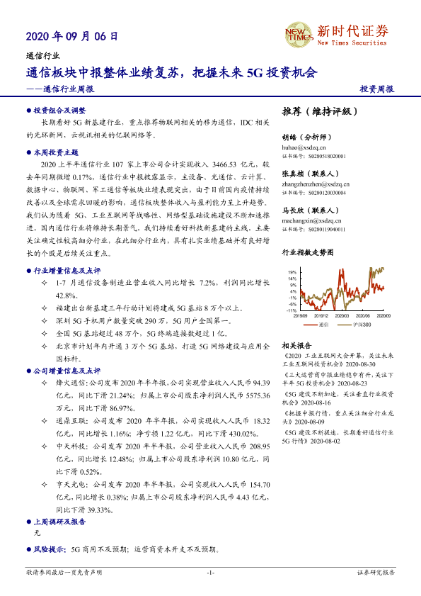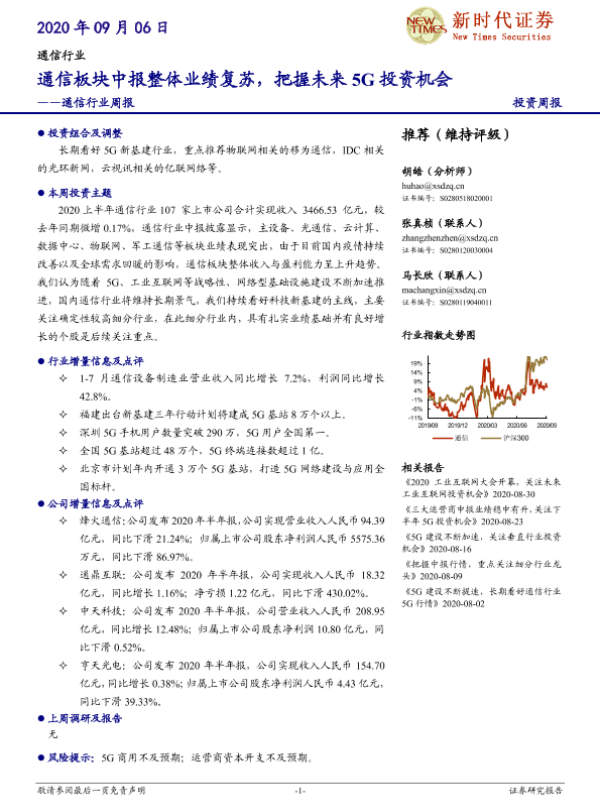 【新时代证券】【20200906】通信行业周报:通信板块中报整体业绩复苏,把握未来5G投资机会-18页