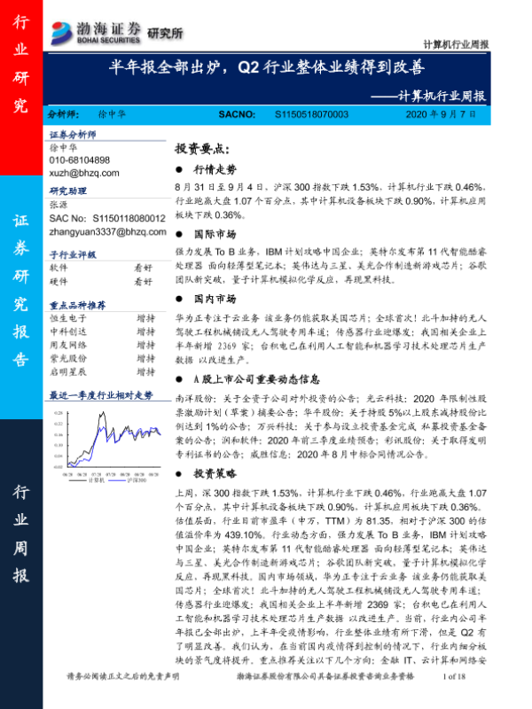 【渤海证券】【20200907】计算机行业周报:半年报全部出炉,Q2行业整体业绩得到改善-18页