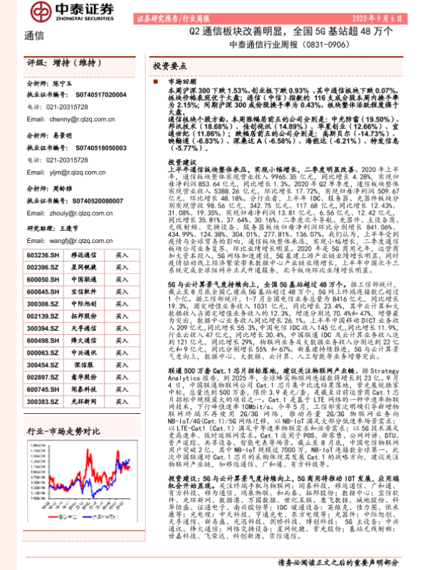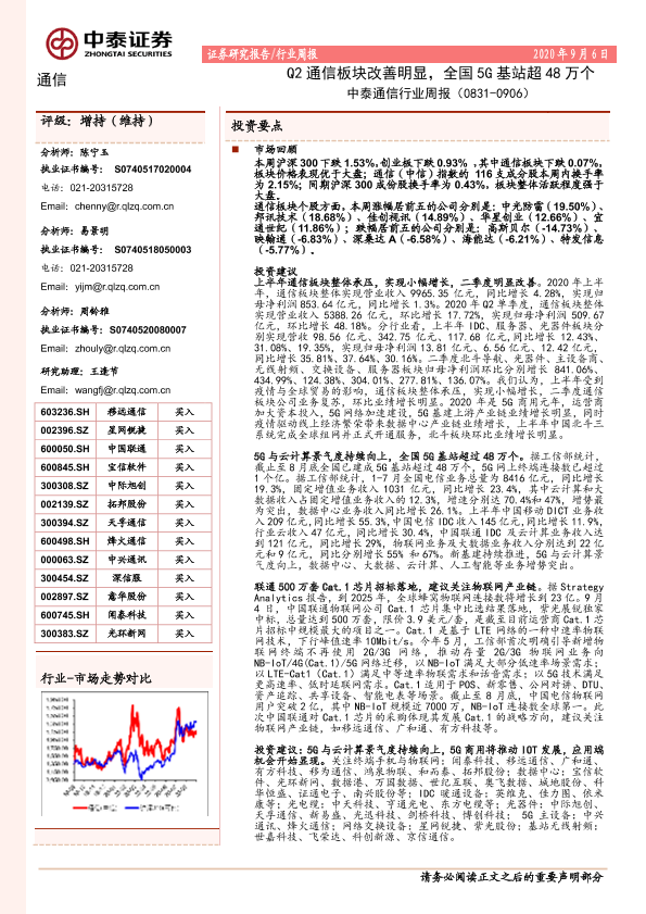 【中泰证券】【20200906】中泰通信行业周报:Q2通信板块改善明显,全国5G基站超48万个-21页