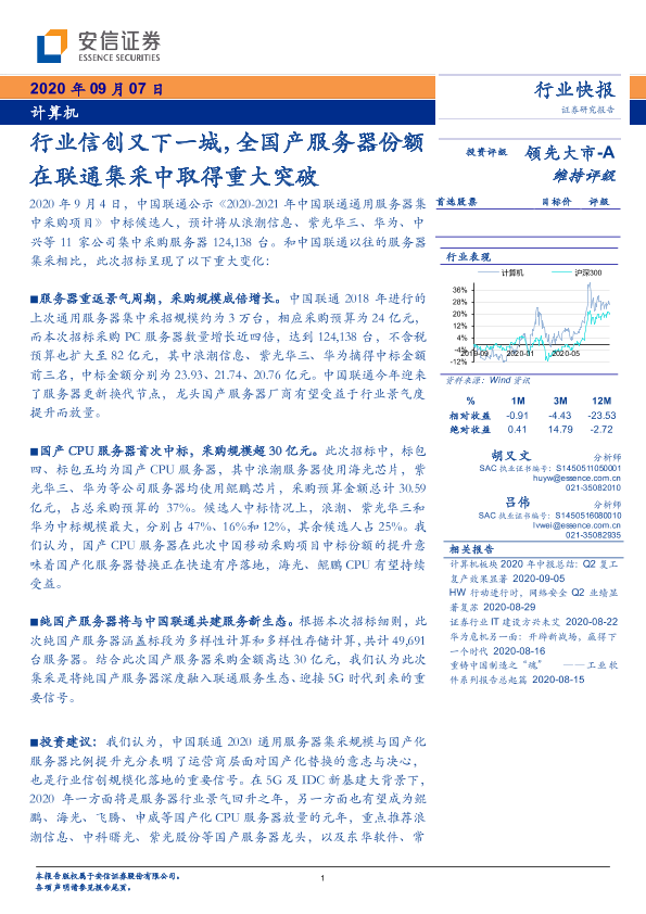 【安信证券】【20200907】行业信创又下一城,全国产服务器份额在联通集采中取得重大突破-5页