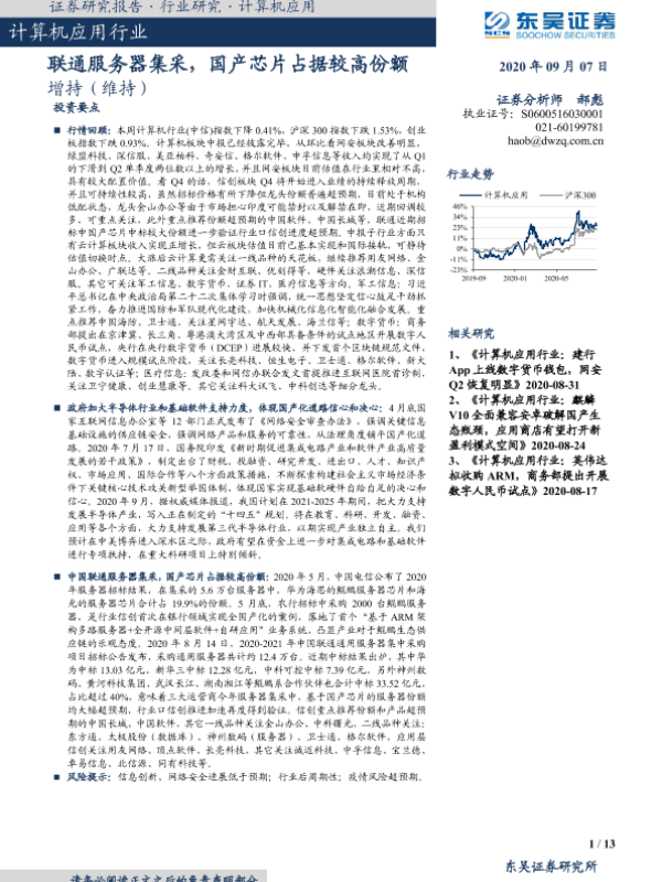 【东吴证券】【20200907】联通服务器集采,国产芯片占据较高份额-13页