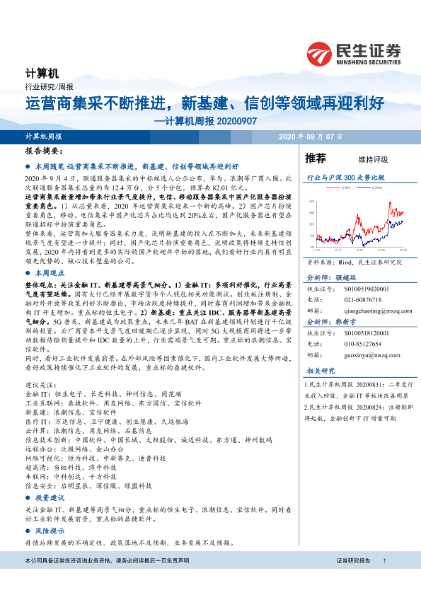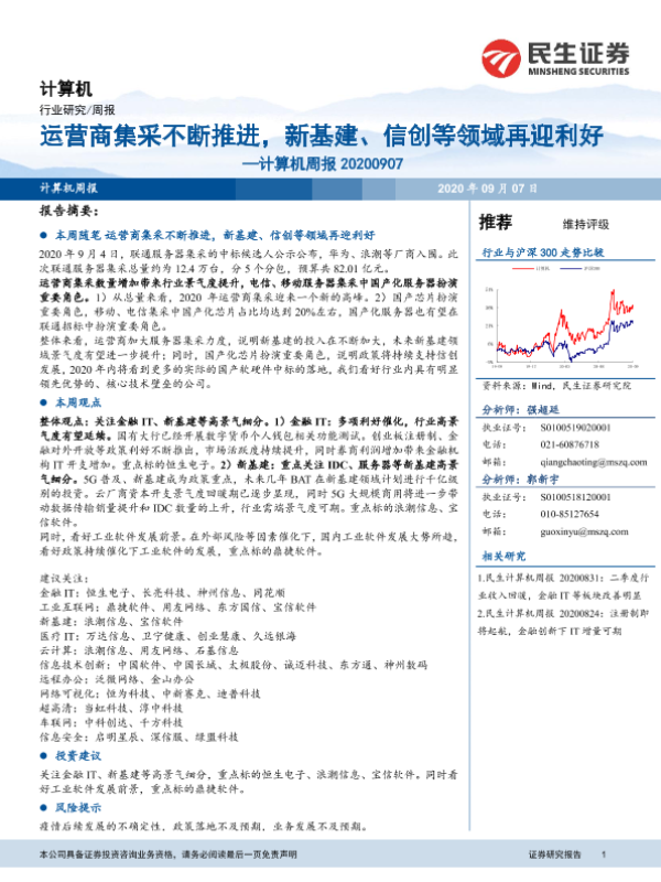 【民生证券】【20200907】20200907-民生证券-计算机周报:运营商集采不断推进,新基建、信创等领域再迎利好-19页