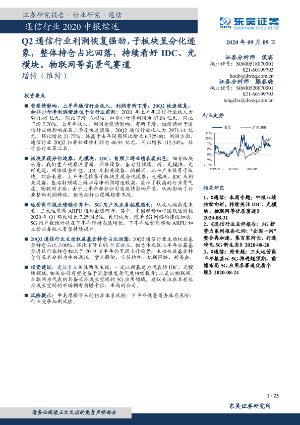 【东吴证券】【202009】通信行业2020中报综述:Q2通信行业利润恢复强劲,子板块呈分化迹象,整体持仓占比回落,持续看好IDC、光模块、物联网等高景气赛道-23页