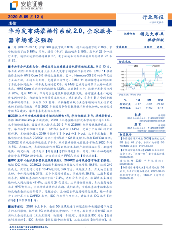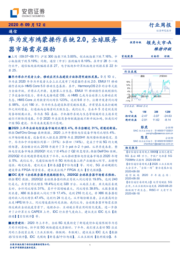 【安信证券】【20200912】20200912-安信证券-通信行业周报:华为发布鸿蒙操作系统2.0,全球服务器市场需求强劲-12页