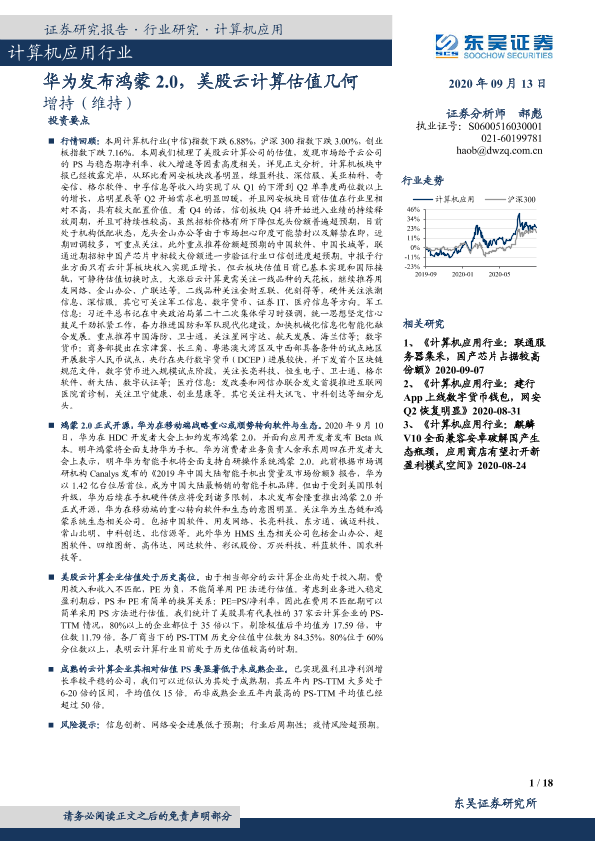 【东吴证券】【20200913】计算机应用行业:华为发布鸿蒙2.0,美股云计算估值几何-18页