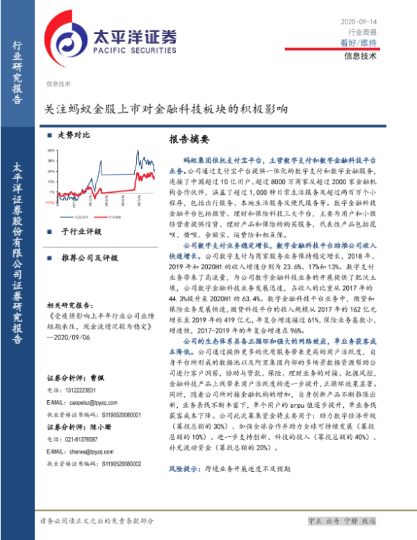 【太平洋证券】【20200914】信息技术行业周报:关注蚂蚁金服上市对金融科技板块的积极影响-13页