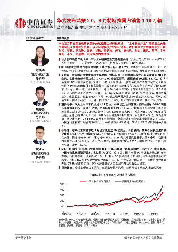 【中信证券】【20200914】全球科技产业周报(第121期):华为发布鸿蒙2.0,8月特斯拉国内销售1.18万辆-17页