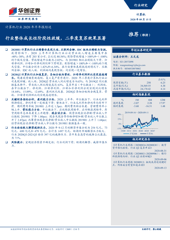 【华创证券】【20200916】计算机行业2020年半年报综述:行业整体成长性阶段性放缓,二季度复苏效果显著-15页