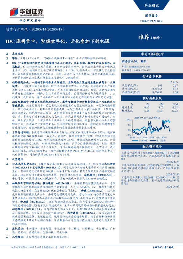 【华创证券】【20200920】20200920-华创证券-通信行业周报:IDC逻辑重申,紧握数字化、云化叠加下的机遇-22页