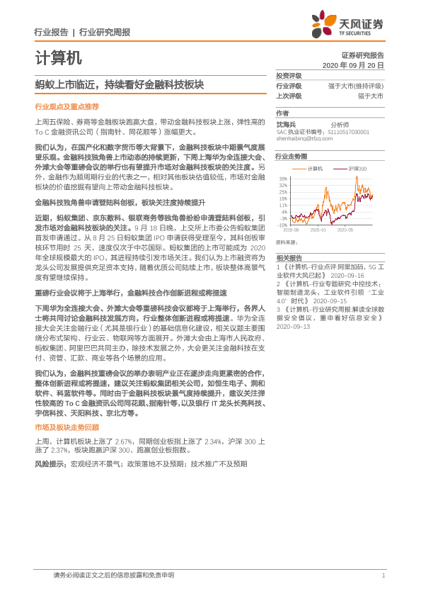 【天风证券】【20200920】20200920-天风证券-计算机行业研究周报:蚂蚁上市临近,持续看好金融科技板块-7页