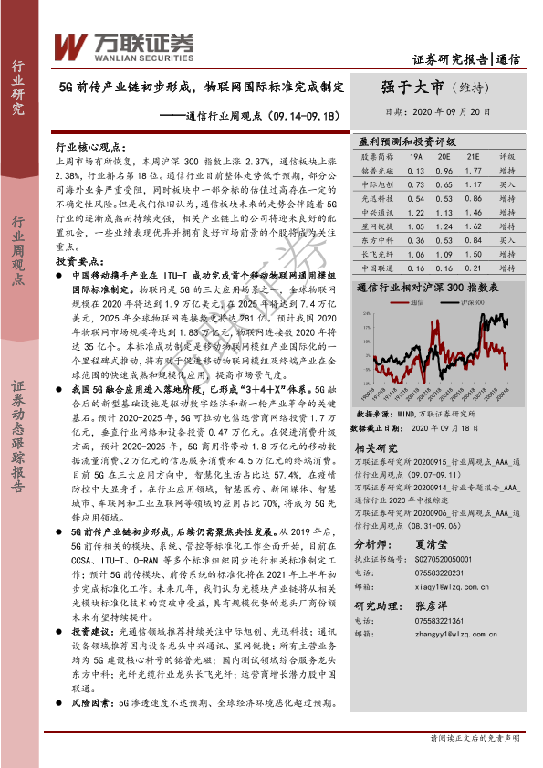 【万联证券】【20200920】通信行业周观点:5G前传产业链初步形成,物联网国际标准完成制定-12页