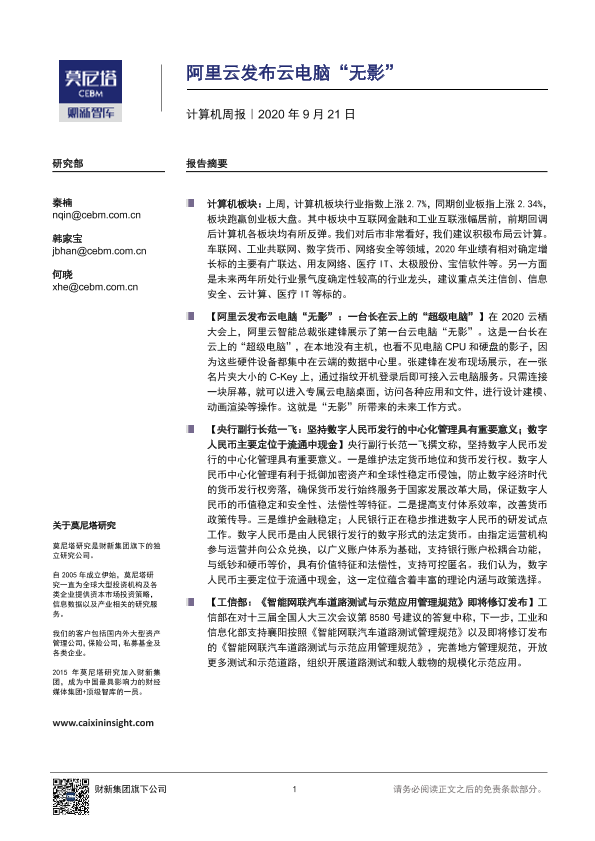 【莫尼塔研究】【20200921】计算机周报:阿里云发布云电脑“无影”-7页