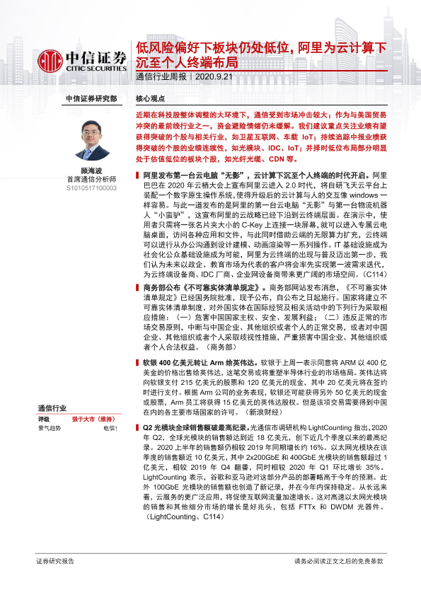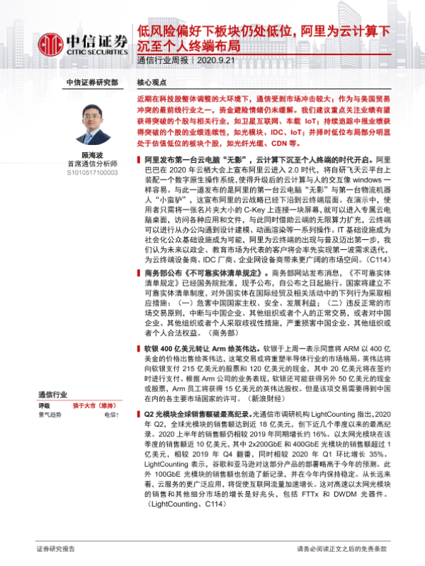【中信证券】【20200921】通信行业周报:低风险偏好下板块仍处低位,阿里为云计算下沉至个人终端布局-9页