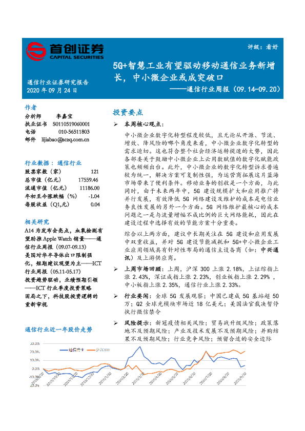 【首创证券】【20200924】20200924-首创证券-通信行业周报:5G+智慧工业有望驱动移动通信业务新增长,中小微企业或成突破口-9页