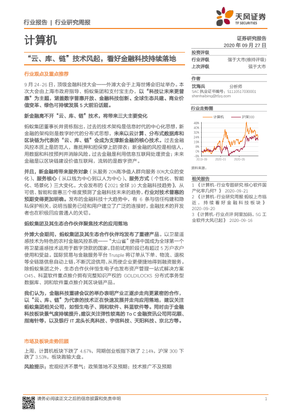 【天风证券】【20200927】计算机行业研究周报:“云、库、链”技术风起,看好金融科技持续落地-8页