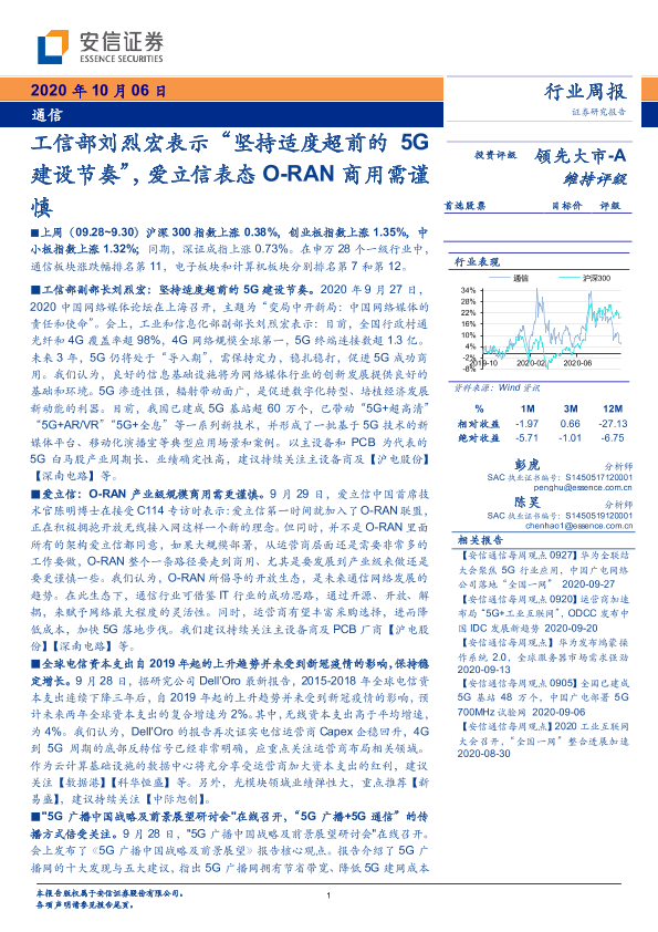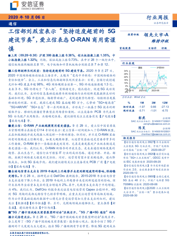 【安信证券】【20201006】20201006-安信证券-通信行业周报:工信部刘烈宏表示“坚持适度超前的5G建设节奏”,爱立信表态O-RAN商用需谨慎-16页