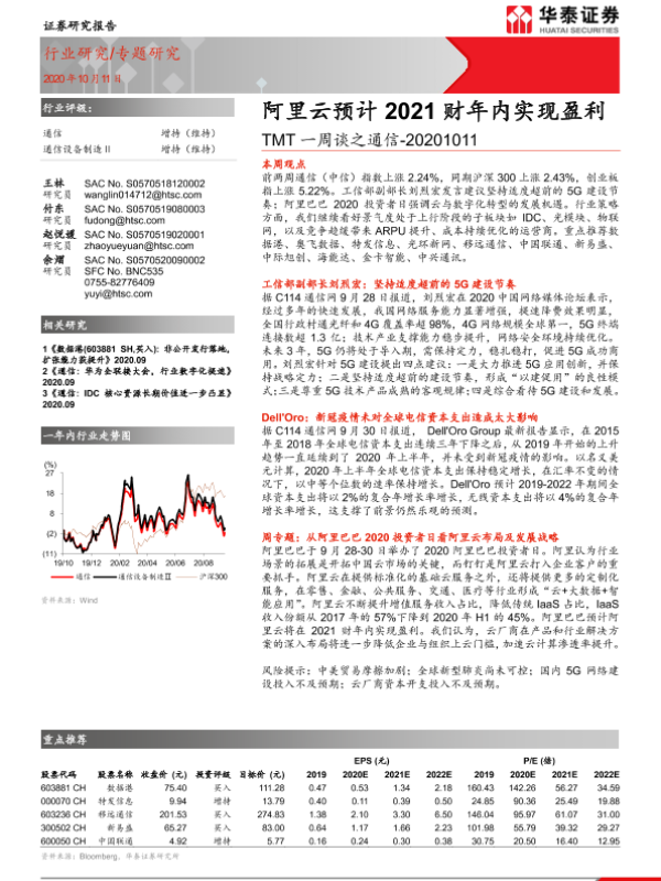 【华泰证券】【20201011】TMT一周谈之通信:阿里云预计2021财年内实现盈利-17页