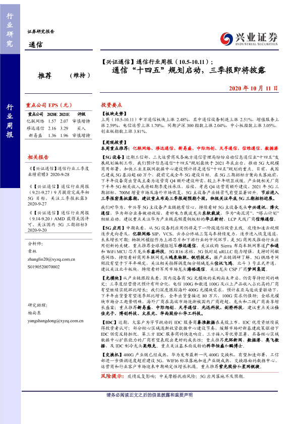 【兴业证券】【20201011】通信行业周报(10.5-10.11):通信“十四五”规划启动,三季报即将披露-8页
