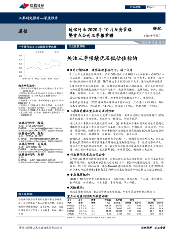 【国信证券】【20201012】通信行业2020年10月投资策略暨重点公司三季报前瞻:关注三季报绩优及低估值标的-15页