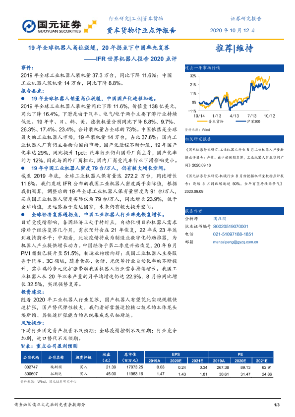 【国元证券】【20201012】20201012-国元证券-IFR世界机器人报告2020点评:19年全球机器人高位放缓,20年拐点下中国率先复苏-3页