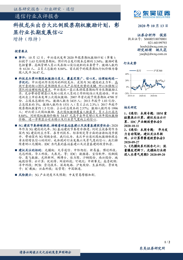 【东吴证券】【20201013】通信行业点评报告:科技龙头出台大比例股票期权激励计划,彰显行业长期发展信心-2页