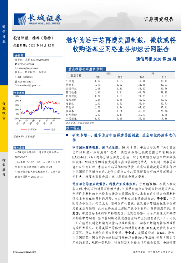 【长城证券】【20201012】通信周报2020第28期:继华为后中芯再遭美国制裁,微软或将收购诺基亚网络业务加速云网融合-31页