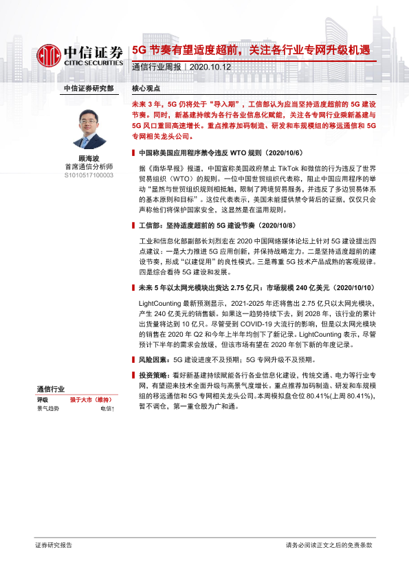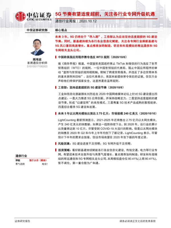 【中信证券】【20201012】通信行业周报:5G节奏有望适度超前,关注各行业专网升级机遇-9页
