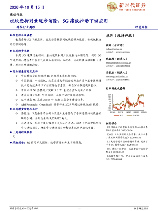 【新时代证券】【20201015】通信行业周报:板块受抑因素逐步消除,5G建设推动下游应用-17页