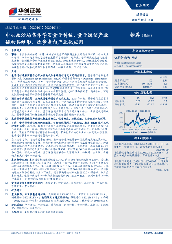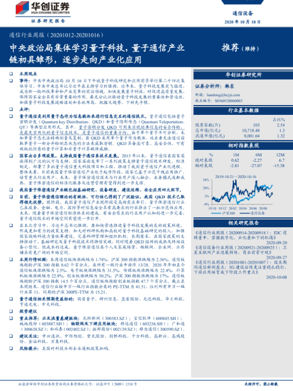 【华创证券】【20201018】通信行业周报:中央政治局集体学习量子科技,量子通信产业链初具雏形,逐步走向产业化应用-26页