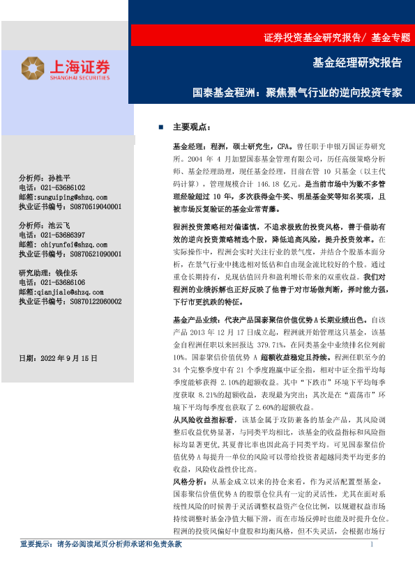 【上海证券】【20220915】基金经理分析报告:国泰基金程洲,聚焦景气行业的逆向投资专家-20页